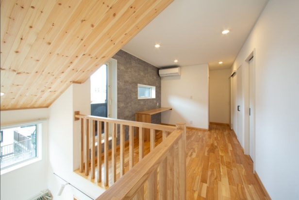 信濃町産の杉を生かした造作カウンター/天井の羽目板貼